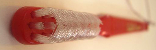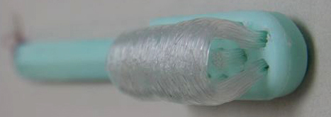 | Detail of head, blue tufts are embedded in white elastomeric |