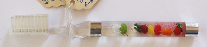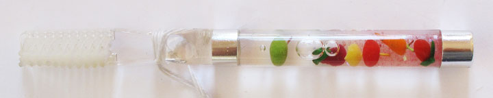 | Color: | clear, with glitters, floating fruit and vegetable inside handle. |