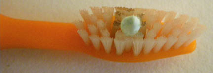 | Toothbrush Type: | Travel toothbrush for camping. It consists of a finger cap, which goes over your index finger [1 inch long], with 5 rows of plastis bristles |